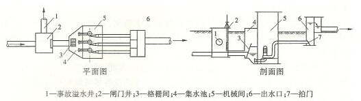 事故溢水井是一個應急放水口,當污水泵站因水泵或能源發(fā)生故障而停止工作時,防止排水干管中水流繼續(xù)流向泵站造成污水淹沒集水池。在泵站進水管前所設的一個閘門井,當泵站出現(xiàn)事故停止工作時,閘門關閉,污水從閘門井中所設的事故排出口排人當?shù)匦l(wèi)生監(jiān)督部門同意的容泄區(qū)。